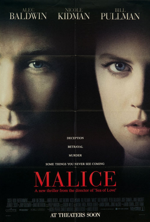 That aside, Malice was a huge surprise because it became a movie that I did not expect it to be. The top-to-bottom quality didn't hurt, either. For one thing, the cast is freakishly-skilled: Bill Pullman, Nicole Kidman, Alec Baldwin, George C. Scott, and Bebe Neuwirth. A small drama would have to be very expensive to do better.